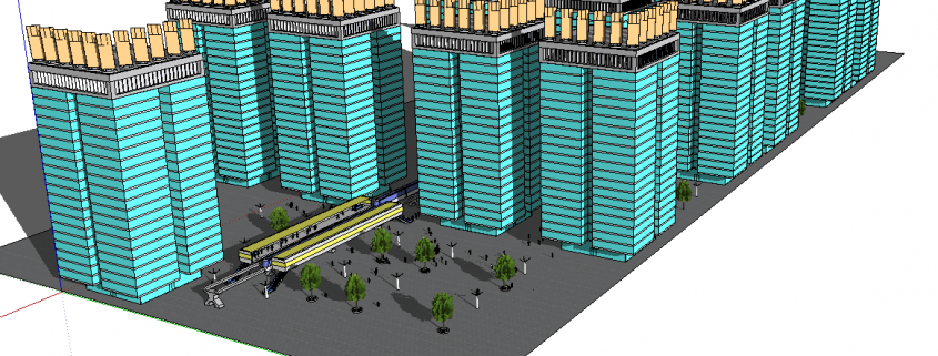Un étage est définitivement prêt. Les étages s’empilent sur une base réduite. Un dernier étage est rempli de turbines et le toit est couvert de miroirs (je vous laisse lire le roman pour en connaître la raison). Puis les tours sont dupliquées et réparties en rang. Un métro aérien se glisse entre les habitations. Et comme toute belle présentation architectural et grâce aux compléments de SketchUp, j’ajoute des arbres et de la population.