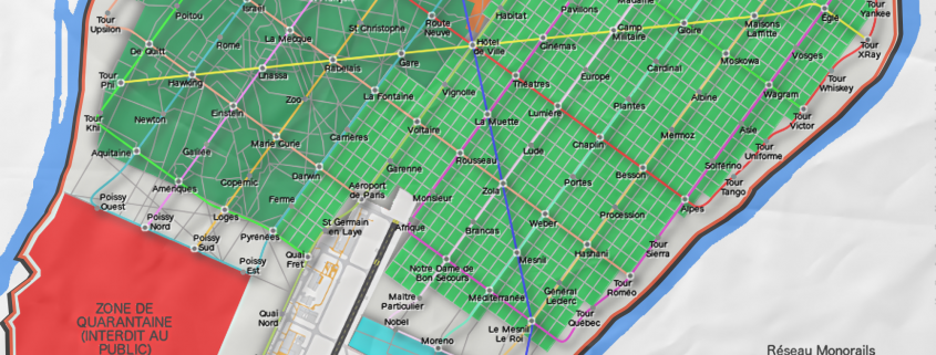 Je change le fond jauni pour un blanc classique. L’image est agrandie et retrouve son format d’origine. Tous les calques sont toilettés, améliorés en netteté et en contraste. Les noms des stations de monorail sont doublés de blanc. Quelques textes en bordures du plan, dont “Paris”, sont réécrits. Au final, deux versions sont éditées, dont une version “froissée”.
