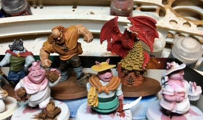 J4 – Jus de sur les peaux du Géant et des Cochons; aplats et jus sur les Loups; brossages et détails de l’Ogre.
