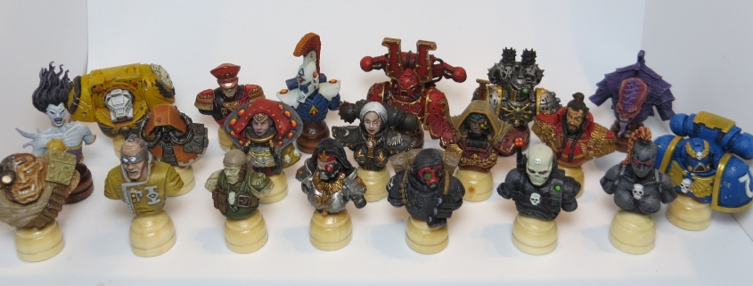 Commençons par les bustes en plastique. Après un ébarbage, chaque figurine reçoit une sous-couche de noir, selon sa dominance à venir. Plus le cycle habituelle d’aplats, de brossages à secs et de lignages suit son cours, en respectant au maximum la charte graphique de la fiche du personnage dédiée. Bien sûr le choix des couleurs se fait selon les pots Citadel en ma possession mais rien d’impossible à respecter.