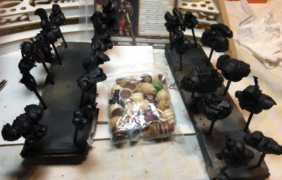 Tout le lot a été sous-couché de Corax White (qui s’est révélé plus couvrante que l’ancienne White Skull), puis badigeonné de Nun Oil.