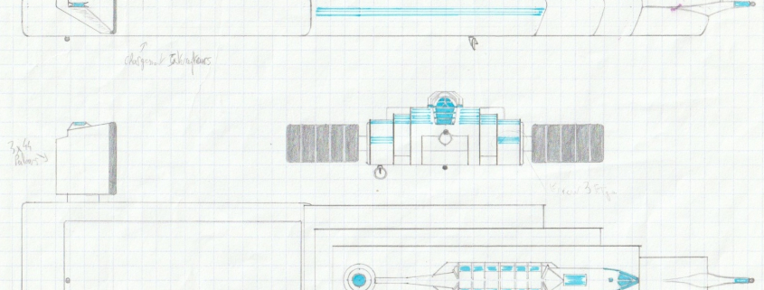 Rebelles est un roman qui mélange les genres, notamment la science-fiction, dont la gestation de ce roman a connu deux périodes. En 1995-97, dans un genre très space opera, puis en 2003 où l’hyper réalisme était de mise. Il existe donc deux versions de croquis pour chaque vaisseau apparaissant dans mon roman. Tous ont été faits au crayon, parfois au feutre, sur du papier à petits carreaux (un carreau fait 5mm sur 5mm).